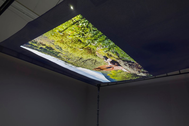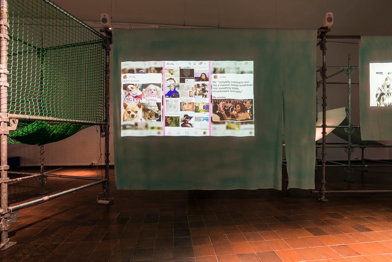 Under del två blir det samtidigt alltför specifikt. Snarare än det digitala rummet verkar denna del faktiskt företrädesvis handla om identitet, närmare bestämt identiteten hos de medverkande memekonstnärerna, _lit_city_ och Vida Lavén. Mötet med konstnärernas instagramflöden tycks riggat för att uppbåda irritation över bristen på substans, inte minst när besökaren nödgas slå sig ned på bänkar eller mattor för att titta på några sekunder långa loopade memevideor som visas upp med hjälp av superprojektorer på stora upphängda lakan. För den som är bekant med sociala medier ter sig både grepp och innehåll tamt och menlöst, för den som tillhör en annan generation eller klass blir det kontextlöst och obegripligt. Inte heller här behöver svagheten ligga hos konstnärerna, det är bristen på sammanhang som spökar.