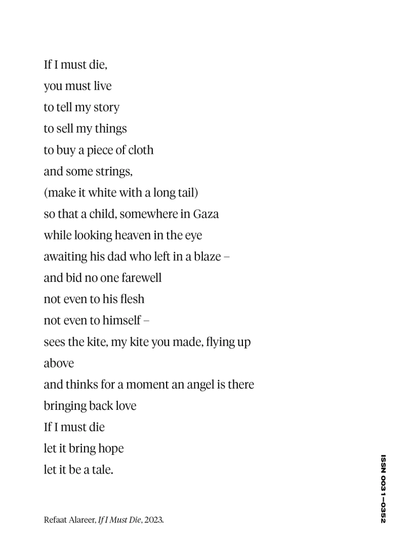 Poeten Tongo Eisen-Martin säger att det inte finns någon ideal stil eller publik, “bara ett forsande sammanhang av språk genom vilket vi rör oss mot frigörelsen”. En liknande poetik klingar i titeln Denna förbindelse mellan alla med lungor av poeten och kritikern Juliana Spahr, som sagt att det är svårt att säga vad en dikts politiska möjligheter är, men att politiken oavbrutet påverkar dikten. Dikten kanske inte kan störta system av förtryck, men den kan åtfölja dig i kampen, likt de grekiska kravallhundarna när de följde med ut med demonstranterna och skällde på poliserna i efterdyningarna av finanskrisen 2008. Spahr nämner dikten som trycks på omslaget av detta nummer av Paletten, If we must die, av poeten Claude McKay (1889-1948). Dikten skrevs i och åtföljde motståndet till vit makt-terrorn mot afroamerikaner i USA under det som kom att kallas den ”röda sommaren” 1919, och har citerats och använts världen över i samband med kamper mot förtryck. Till exempel spreds den bland fångarna på Attica och skrevs på väggarna under fångupproret 1971 och idag, över 100 år senare, minns vi den genom den palestinska poeten Refaat Alareers dikt If I must die. Den skrevs första november i år, bara några veckor innan han blev mördad tillsammans med familjemedlemmar i Gaza i en attack av den israeliska, bosättarkolonialistiska apartheidmakten.